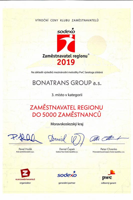 BONATRANS GROUP a.s. gewann den 3. Platz in dem Wettbewerb „Arbeitgeber des Jahres 2019 der Region Moravia-Silesia“ in der Kategorie bis 5000 Mitarbeiter. Herr Tomáš Král, Finanzdirektor der BONATRANS GROUP a.s., nahm den Preis entgegen.